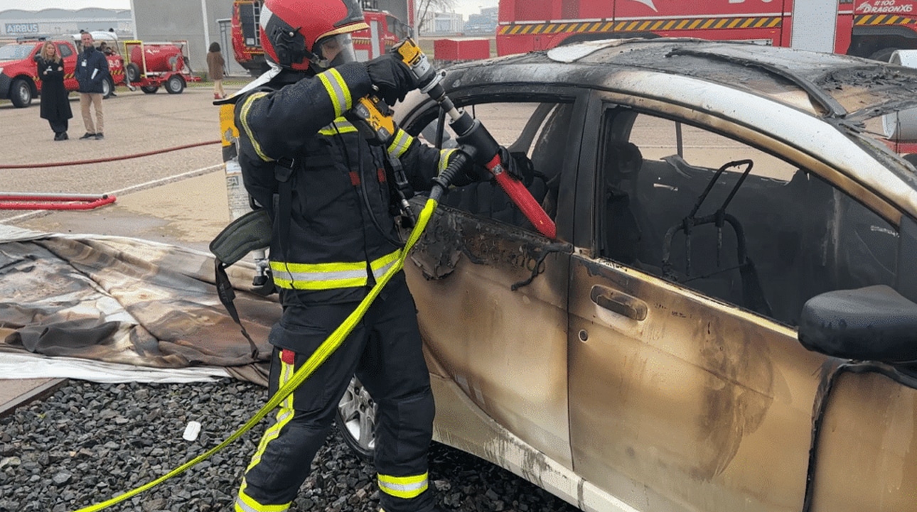 Este vídeo muestra una demostración en vivo que realizamos durante un taller sobre contención de incendios en vehículos eléctricos (EV) en el aeropuerto de Sevilla, España. Se desplegó el concepto completo de Fire Isolator en un vehículo eléctrico en llamas, incluyendo un escenario de thermal runaway.