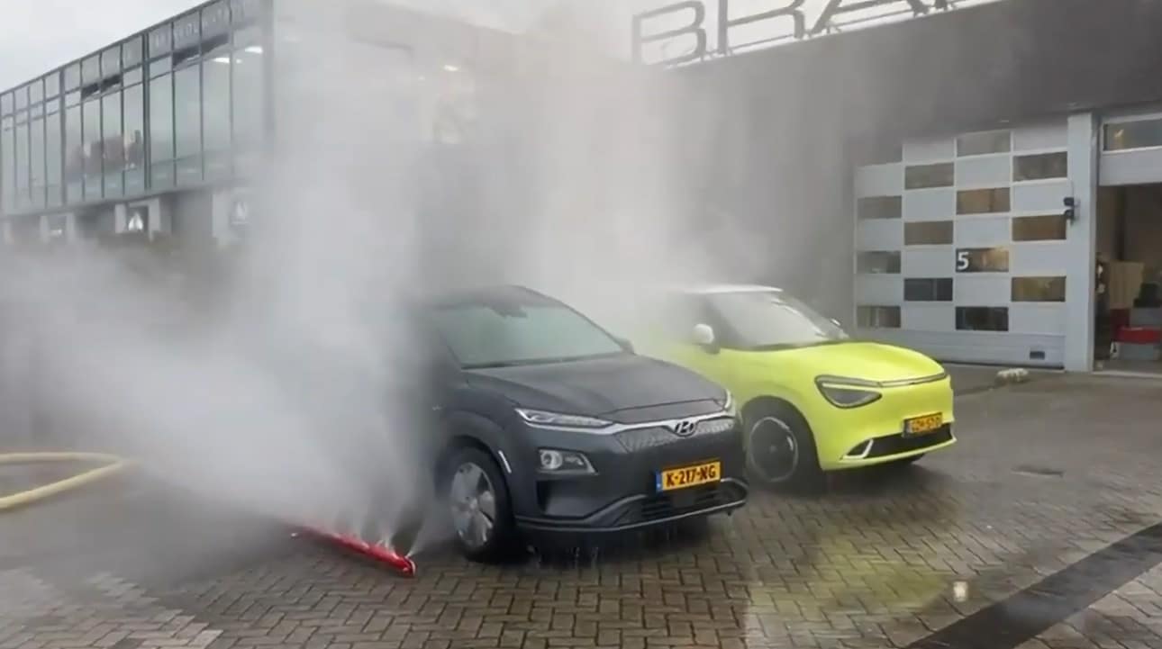 La televisión nacional coreana emitió un reportaje sobre una prueba de incendio en un vehículo eléctrico con nuestro concepto de aislante de incendios. La gente tiró con éxito de la manta sobre el vehículo eléctrico en llamas, desplegó las unidades de aerosol y roció agua nebulizada sobre el coche.